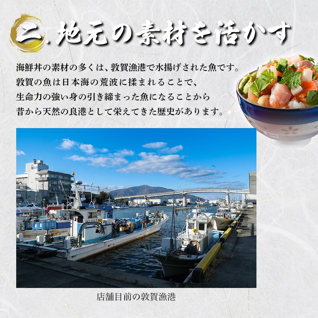 うお吟の名物『恵びす丼』は、真鯛・鰤・イカ・タコ・福井サーモン・バイ貝・甘海老など、地元漁港に水揚げされた新鮮な魚介をふんだんに織り交ぜた海鮮丼です。